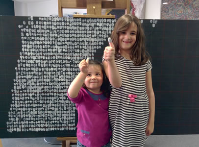 Les personnes réalisent cette oeuvre artistique par petites touches en apposant leurs empreintes digitales sur une toile suivant une trame prédéfinie.